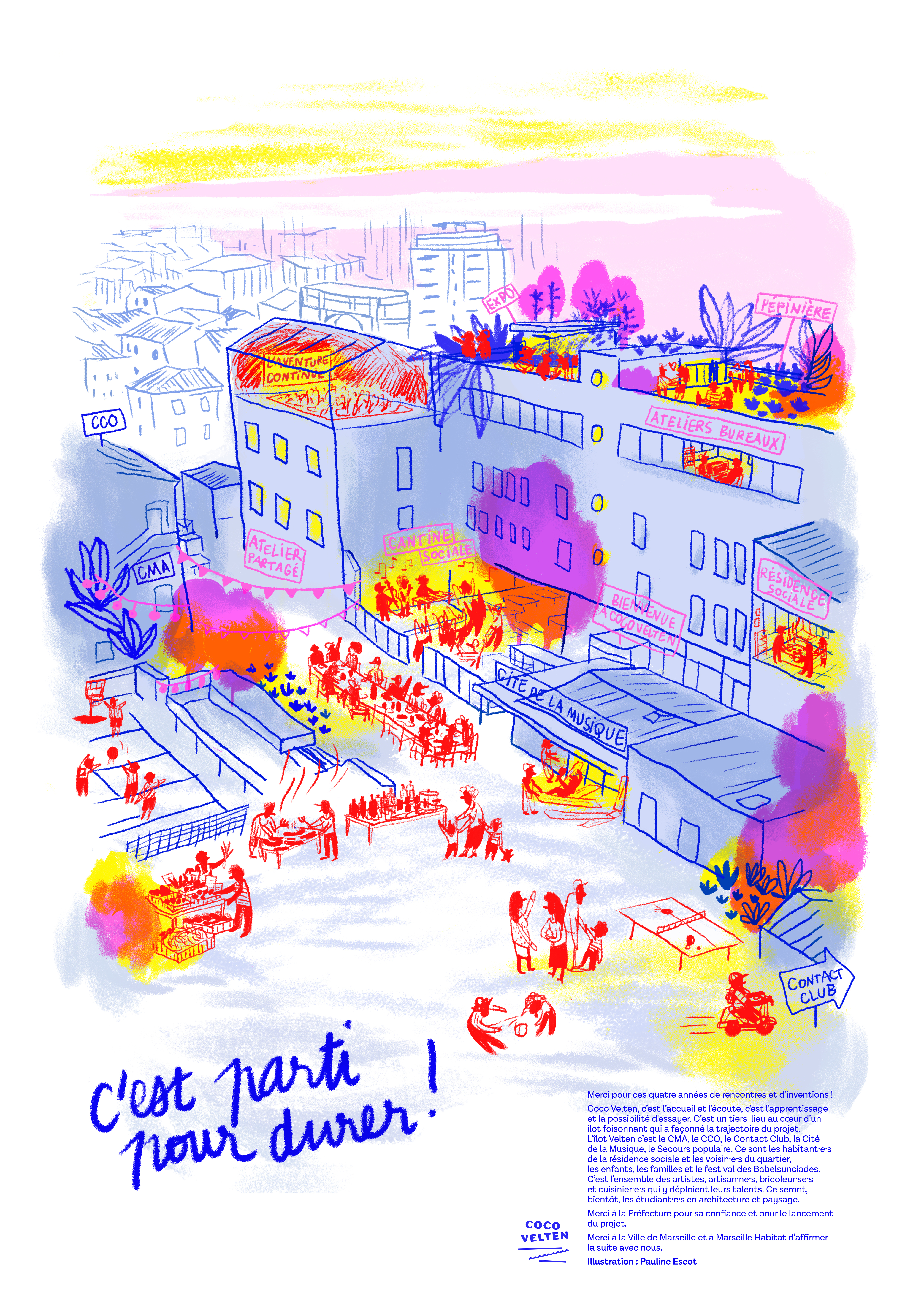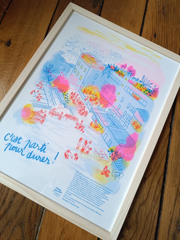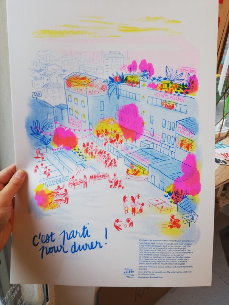 Commande de l’association Yes We Camp. Illustration de la fourmilière artistique, culturelle et sociale qu’a été le tiers-lieu COCO VELTEN, à Marseille, pendant 6 ans. Affiche A2 réalisée à la tablette graphique puis imprimée en risographie chez Quintal Atelier.