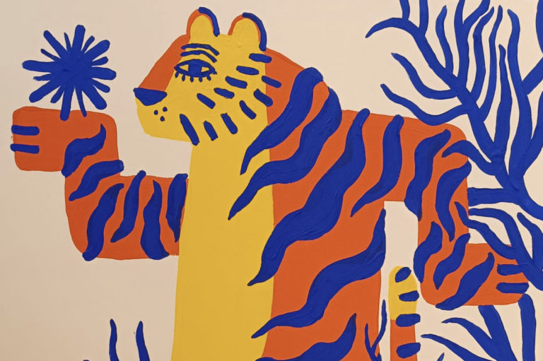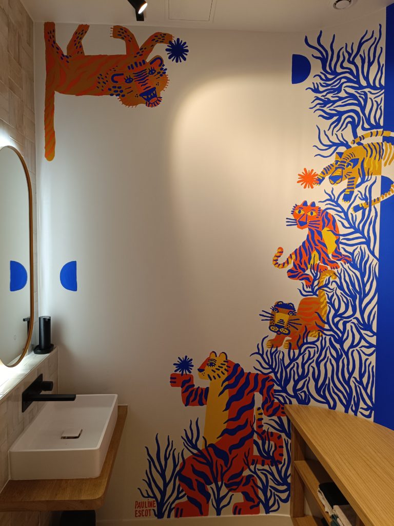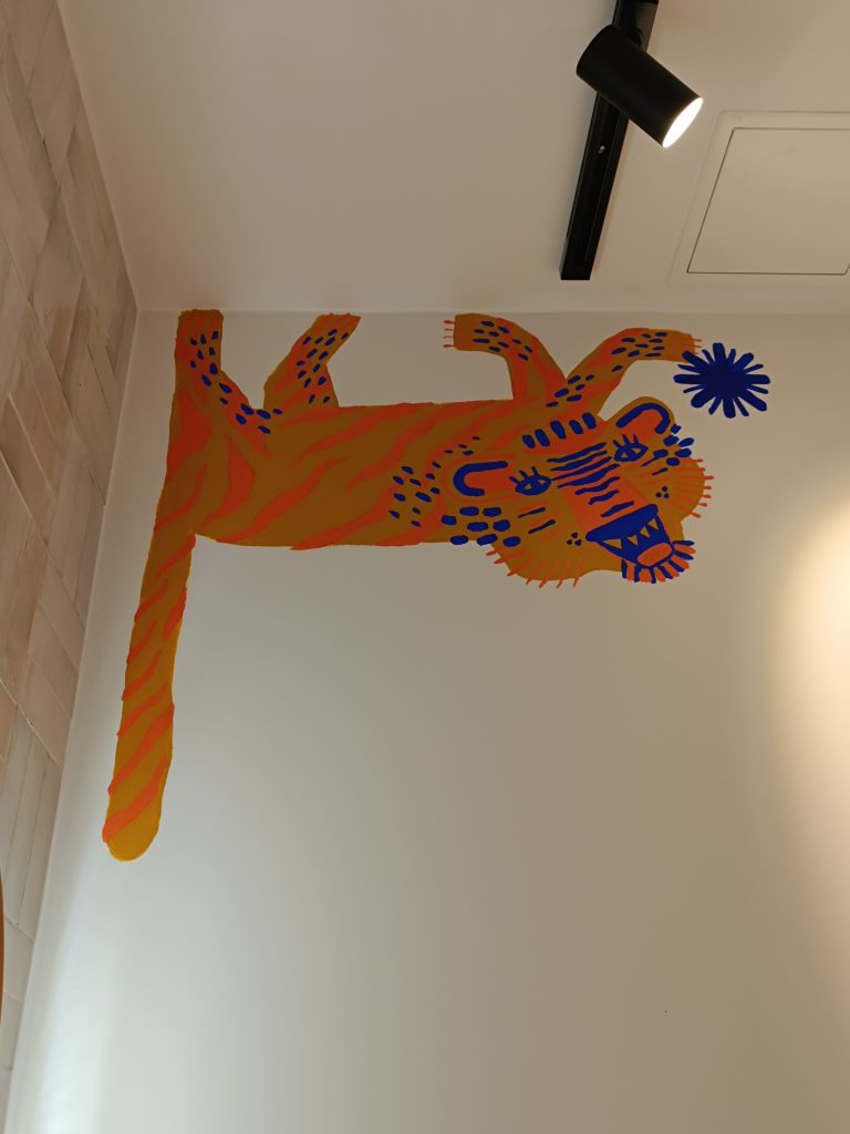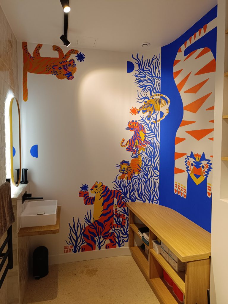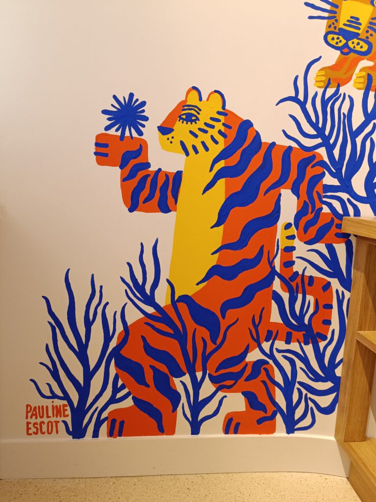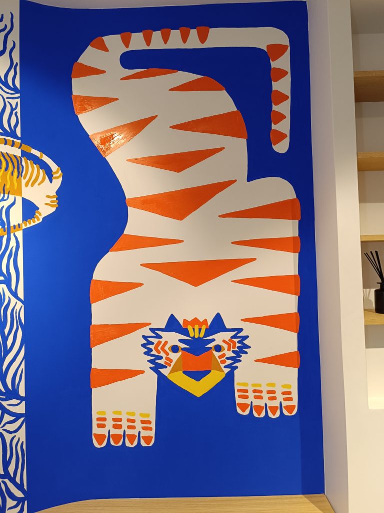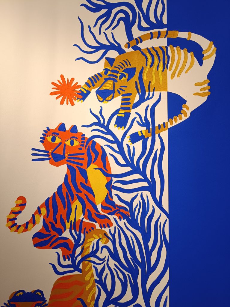 Réalisation d’une fresque décorative dans les locaux de la société de production cinéma @easytigerprod. Variations colorées de tigres aux divers caractères, jouant et dansant au milieu d’un décor Bleu Vidéo 🐅