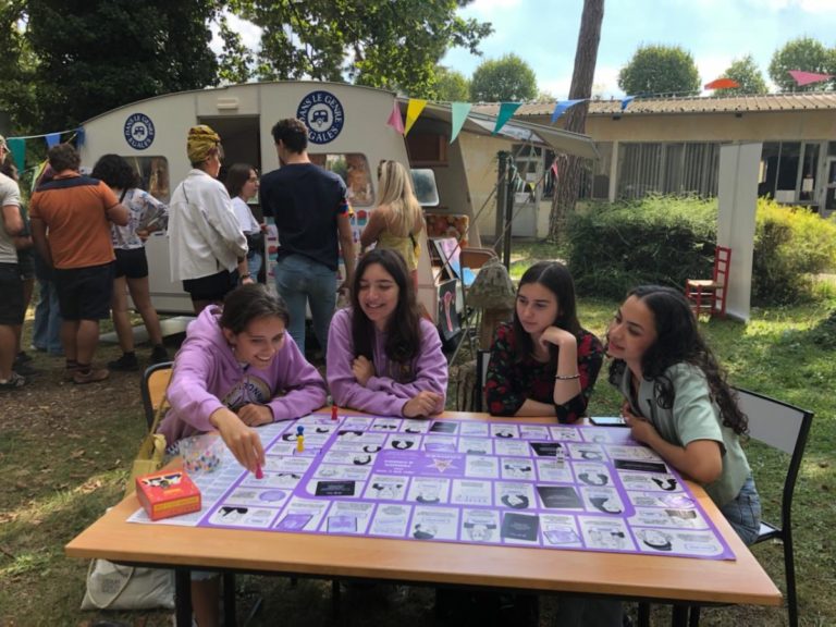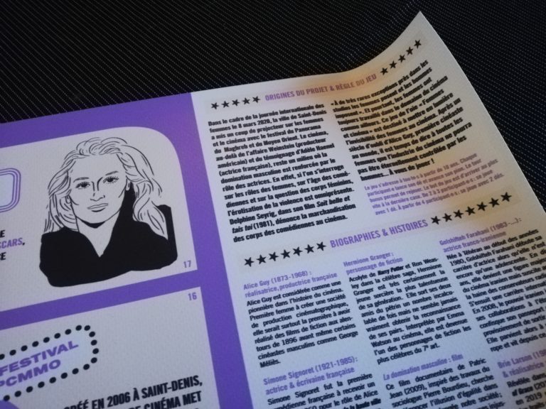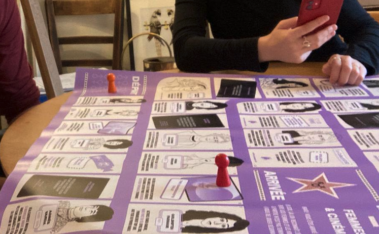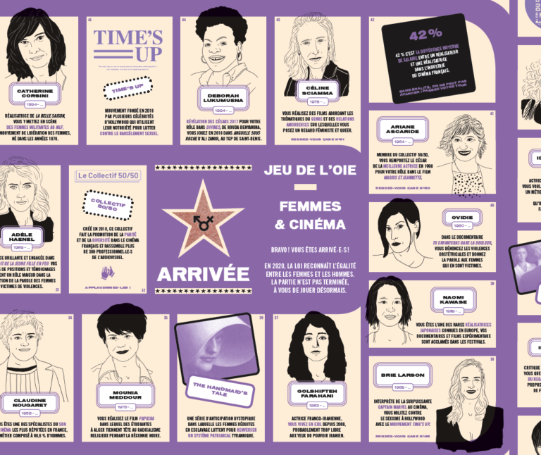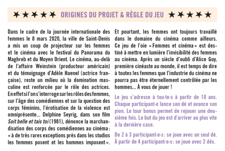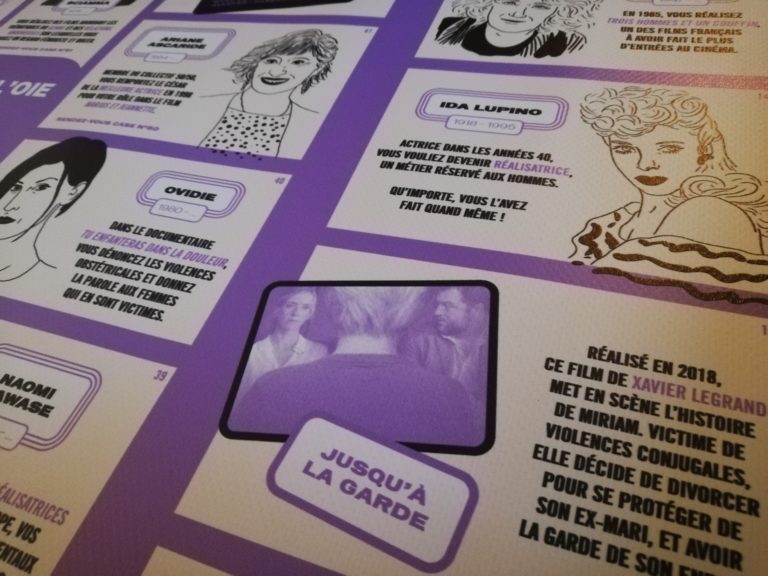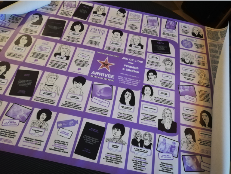 En 2013, je réalisais un JEU DE LOIS POUR L’ÉGALITÉ avec la Mission Droits des femmes de la Ville de Saint-Denis (93) – un projet à l’initiative de Marie Leroy et Elise Herting. Ce deuxième jeu a vu le jour en 2020, débutant une nouvelle série de jeux de l’oie sur des thématiques en lien avec l’égalité : celui-ci porte sur « Femmes et Cinéma » et a été imprimé en 50 exemplaires.