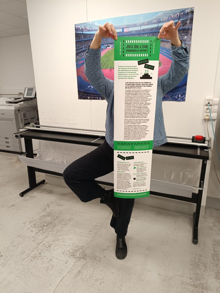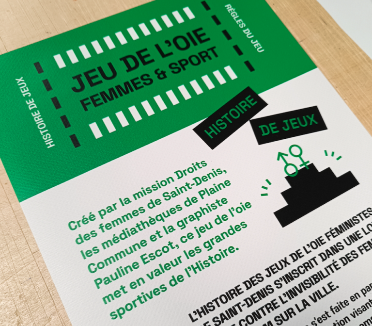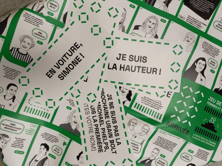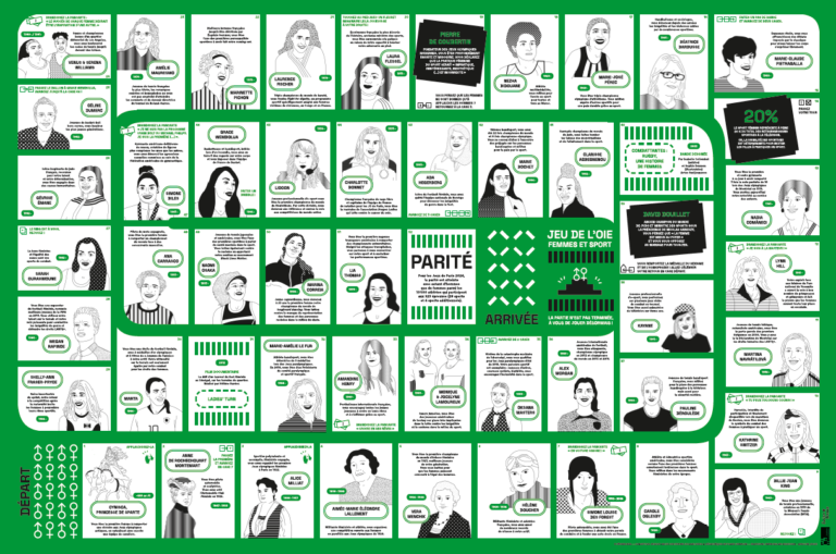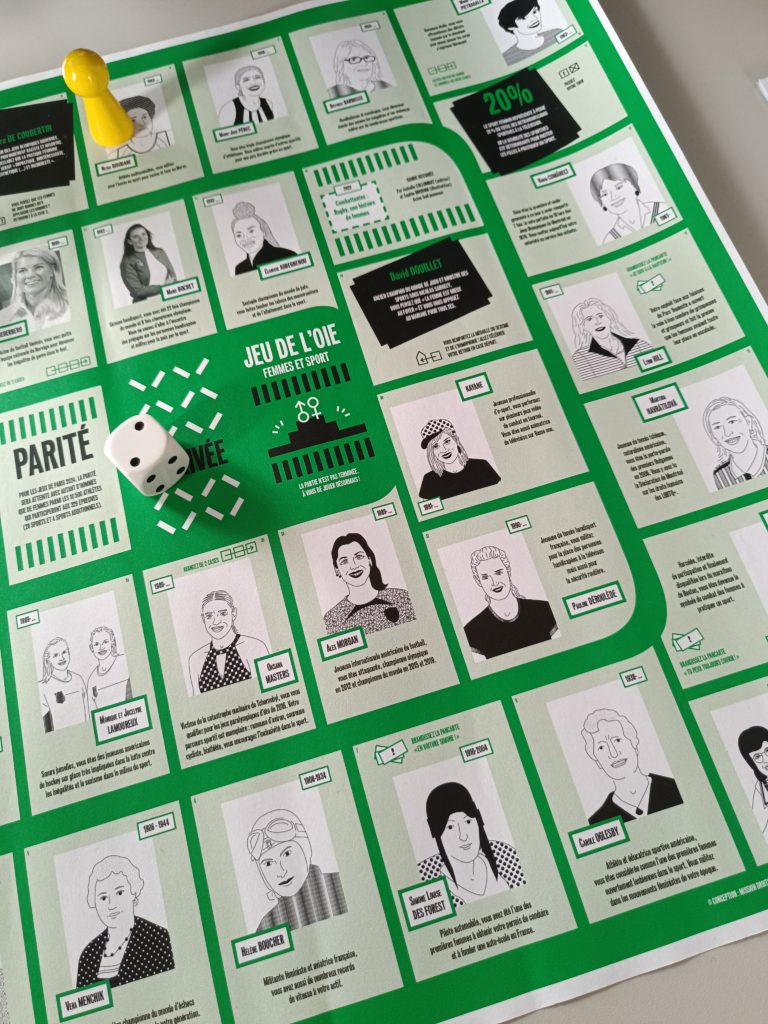 Après le premier sur l’histoire de l’égalité hommes-femmes, le second sur les Femmes et le Cinéma, suivi de celui sur Femmes et Théâtre… Voici le Numéro 4 d’une belle série de jeux qui ne cesse d’évoluer au fil des années et profiter à tout un tas d’institutions, écoles, structures publiques, associations, centres sociaux qui utilisent ce jeu grand format afin d’animer débats et ateliers culturels ! L’année 2024 était celle des Jeux Olympiques, l’occasion pour la Mission droits des femmes d’aller à la rencontre d’associations et acteur•ice•s sportif•ve•s à Saint-Denis et de travailler avec le réseau de médiathèques Plaine Commune pour diffuser le savoir autour des femmes ayant fait date et ou brillant encore aujourd’hui dans le monde du sport.