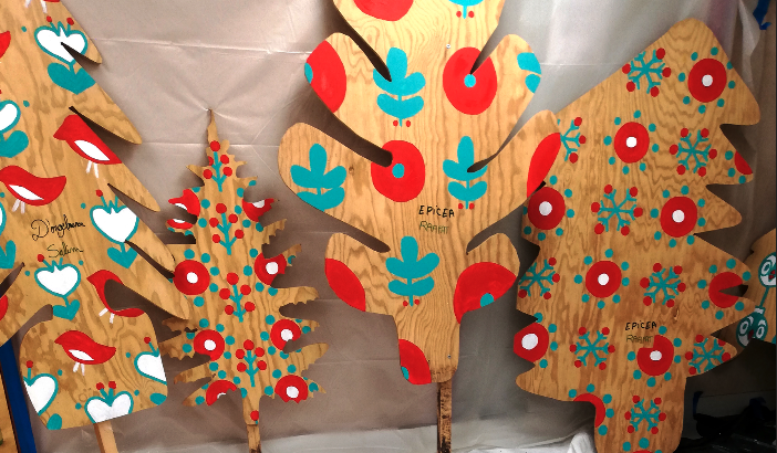 Motifs peints à la main sur les sapins de bois imaginés en 2020 par @premicesandco 🙂 Réalisation conviviale avec l’aide de @wearein_agency